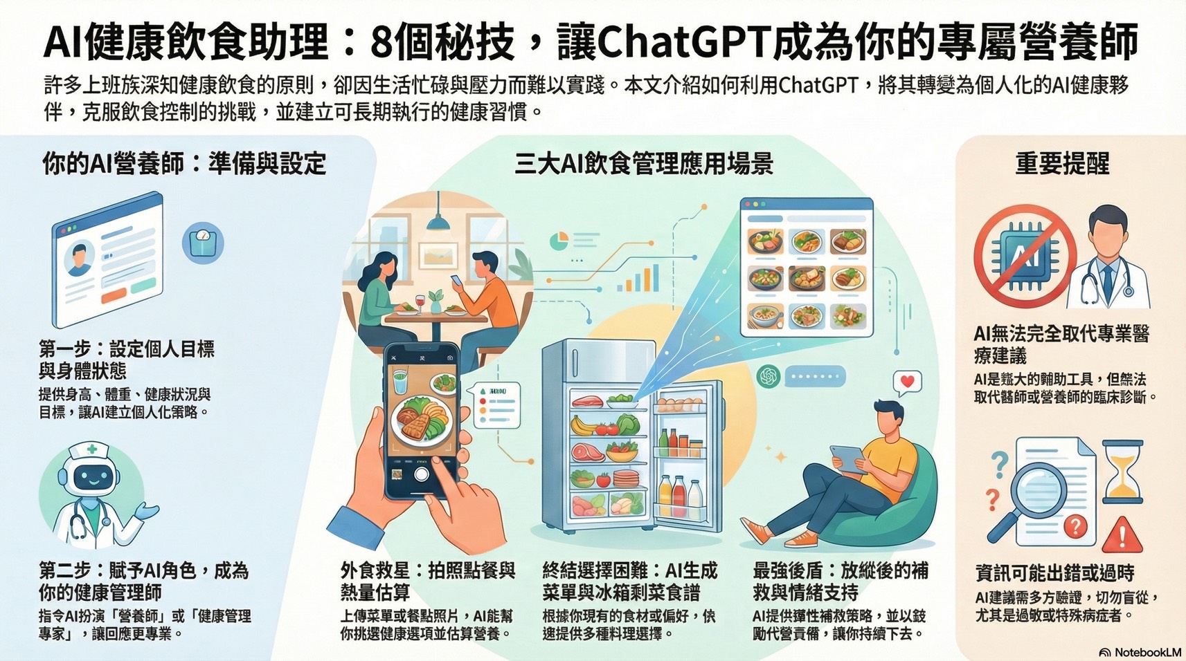 介紹AI在健康管理與數位安全方面的應用。內容包括健康資訊查詢、用藥提醒、以及如何辨識網路詐騙與可疑訊息等。同時也會分享AI在未來生活中的發展趨勢,例如智慧家庭、遠距醫療與個人化服務等,讓學員了解AI科技如何持續改變我們的生活方式。透過本單元,學員將建立更完整的AI生活應用觀念,並具備基本的數位安全意識。穿戴式裝置與健康數據:解讀智慧手錶/手環的健康數據 (心率、血氧、睡眠);AI營養師藉由拍照分析食物,計算熱量與營養素;遠距醫療與AI輔助診斷的未來展望。